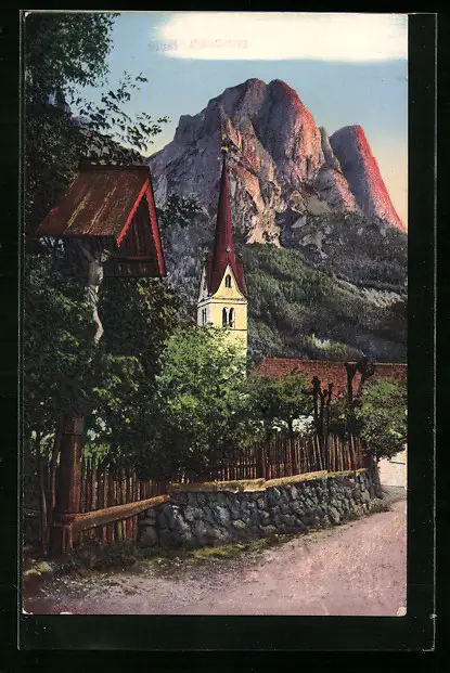 AK Seis am Schlern, Strassenpartie mit der Kirche im Abendrot