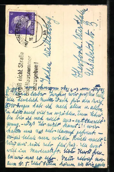 Personenbezogene Daten auf der Rückseite der Karte wurden durch blauen Textmarker unkenntlich gemacht. Die blauen Stellen sind auf die Vorderseite durchgeweicht und wirken sich negativ auf das Postkartenfoto aus