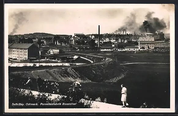 AK Selb, Porzellanfabrik Rosenthal mit Bahndamm