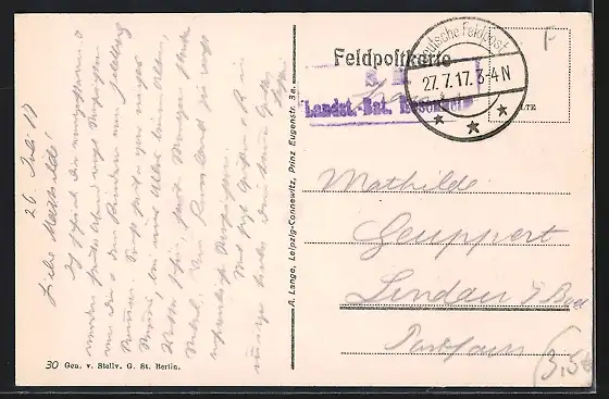 gelaufen 1917, Eckknick oben li., Stempelspur, guter Zustand