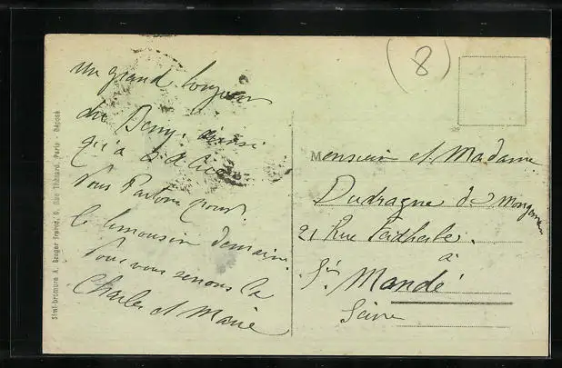 Personenbezogene Daten auf der Rückseite der Karte wurden durch blauen Textmarker unkenntlich gemacht. Die blauen Stellen sind auf die Vorderseite durchgeweicht und wirken sich negativ auf das Postkartenfoto aus