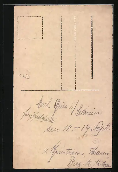 Personenbezogene Daten auf der Rückseite der Karte wurden durch blauen Textmarker unkenntlich gemacht. Die blauen Stellen sind auf die Vorderseite durchgeweicht und wirken sich negativ auf das Postkartenfoto aus