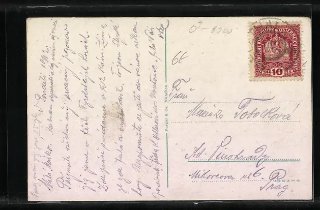 Personenbezogene Daten auf der Rückseite der Karte wurden durch blauen Textmarker unkenntlich gemacht. Die blauen Stellen sind auf die Vorderseite durchgeweicht und wirken sich negativ auf das Postkartenfoto aus