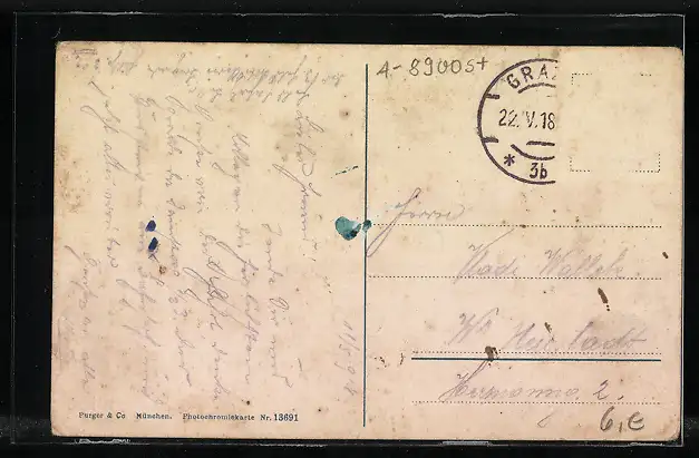 gelaufen 1918, Briefmarke entfernt, Bugspur re. oben, guter Zustand