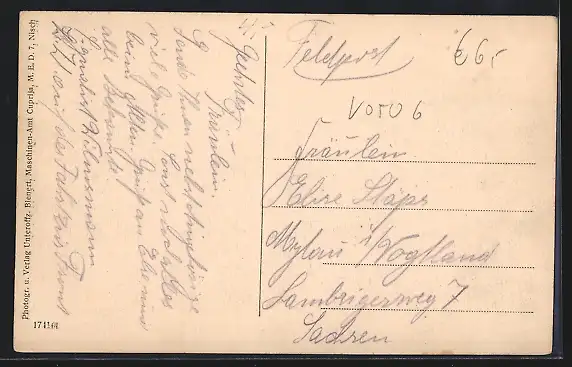 Personenbezogene Daten auf der Rückseite der Karte wurden durch blauen Textmarker unkenntlich gemacht. Die blauen Stellen sind auf die Vorderseite durchgeweicht und wirken sich negativ auf das Postkartenfoto aus