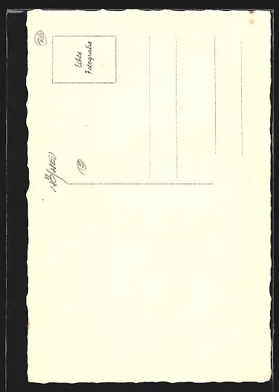 Personenbezogene Daten auf der Rückseite der Karte wurden durch blauen Textmarker unkenntlich gemacht. Die blauen Stellen sind auf die Vorderseite durchgeweicht und wirken sich negativ auf das Postkartenfoto aus