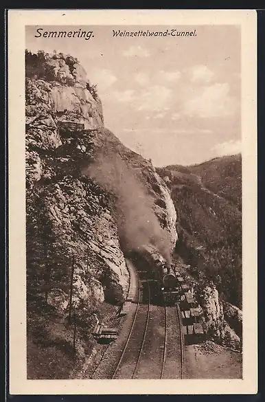 AK Semmering, Weinzettelwand-Tunnel mit Eisenbahn aus der Vogelschau