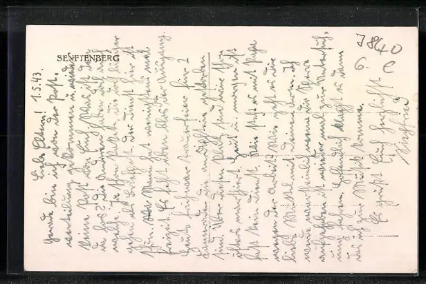 Personenbezogene Daten auf der Rückseite der Karte wurden durch blauen Textmarker unkenntlich gemacht. Die blauen Stellen sind auf die Vorderseite durchgeweicht und wirken sich negativ auf das Postkartenfoto aus