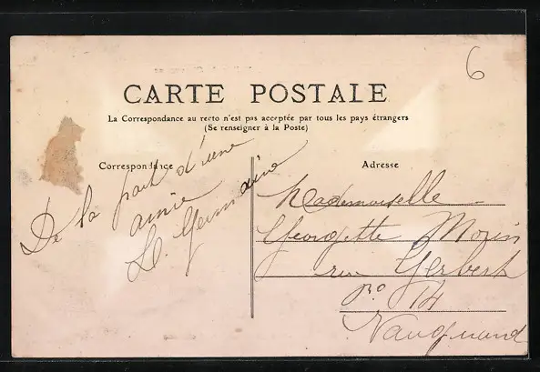 Personenbezogene Daten auf der Rückseite der Karte wurden durch blauen Textmarker unkenntlich gemacht. Die blauen Stellen sind auf die Vorderseite durchgeweicht und wirken sich negativ auf das Postkartenfoto aus