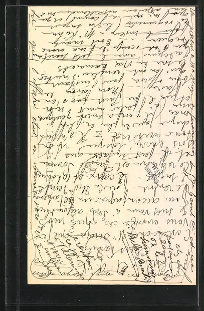 Personenbezogene Daten auf der Rückseite der Karte wurden durch blauen Textmarker unkenntlich gemacht. Die blauen Stellen sind auf die Vorderseite durchgeweicht und wirken sich negativ auf das Postkartenfoto aus