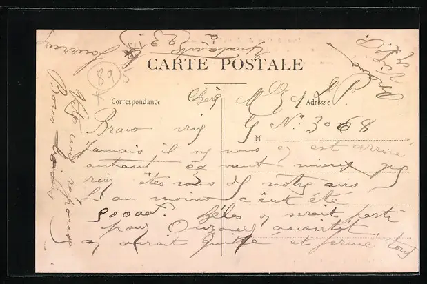 Personenbezogene Daten auf der Rückseite der Karte wurden durch blauen Textmarker unkenntlich gemacht. Die blauen Stellen sind auf die Vorderseite durchgeweicht und wirken sich negativ auf das Postkartenfoto aus