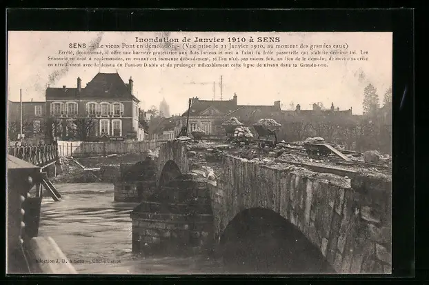 AK Sens, inondations 1910, le vieux pont en demolition