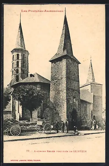 AK Sentein, Ancienne église fortifiée et charrettes devant l`entrée