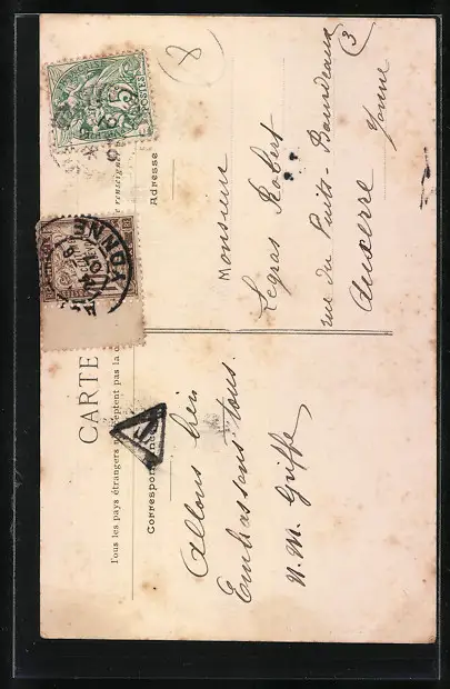 Personenbezogene Daten auf der Rückseite der Karte wurden durch blauen Textmarker unkenntlich gemacht. Die blauen Stellen sind auf die Vorderseite durchgeweicht und wirken sich negativ auf das Postkartenfoto aus