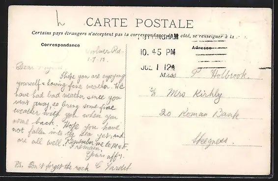 gelaufen 1912, Briefmarke entfernt, rückseitig Oberflächenschaden, guter Zustand