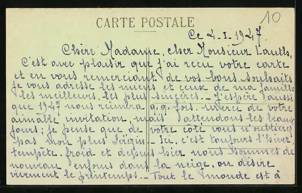 Personenbezogene Daten auf der Rückseite der Karte wurden durch blauen Textmarker unkenntlich gemacht. Die blauen Stellen sind auf die Vorderseite durchgeweicht und wirken sich negativ auf das Postkartenfoto aus