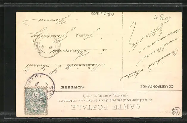 Personenbezogene Daten auf der Rückseite der Karte wurden durch blauen Textmarker unkenntlich gemacht. Die blauen Stellen sind auf die Vorderseite durchgeweicht und wirken sich negativ auf das Postkartenfoto aus