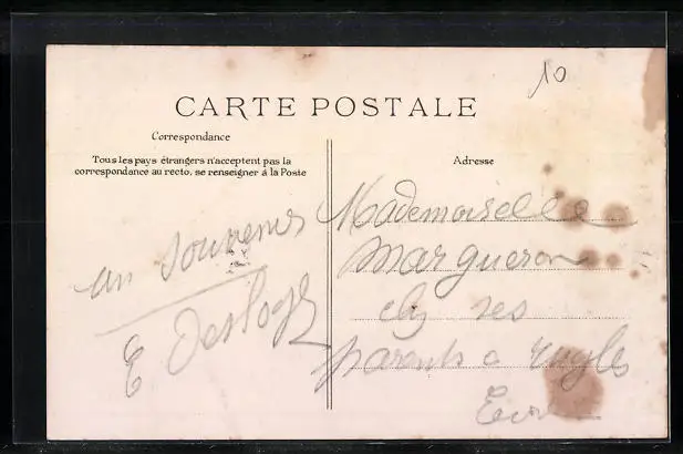 Personenbezogene Daten auf der Rückseite der Karte wurden durch blauen Textmarker unkenntlich gemacht. Die blauen Stellen sind auf die Vorderseite durchgeweicht und wirken sich negativ auf das Postkartenfoto aus