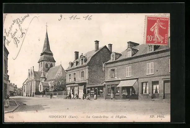 AK Serquigny, la Grande-Rue et l'Eglise