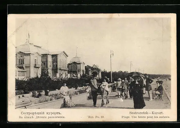 AK Sestroretzk-Kurort, Partie an der Strandpromenade mit Kind auf Maultier