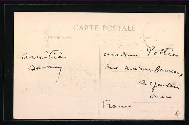 Personenbezogene Daten auf der Rückseite der Karte wurden durch blauen Textmarker unkenntlich gemacht. Die blauen Stellen sind auf die Vorderseite durchgeweicht und wirken sich negativ auf das Postkartenfoto aus
