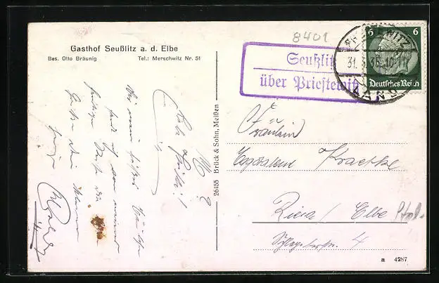 Personenbezogene Daten auf der Rückseite der Karte wurden durch blauen Textmarker unkenntlich gemacht. Die blauen Stellen sind auf die Vorderseite durchgeweicht und wirken sich negativ auf das Postkartenfoto aus