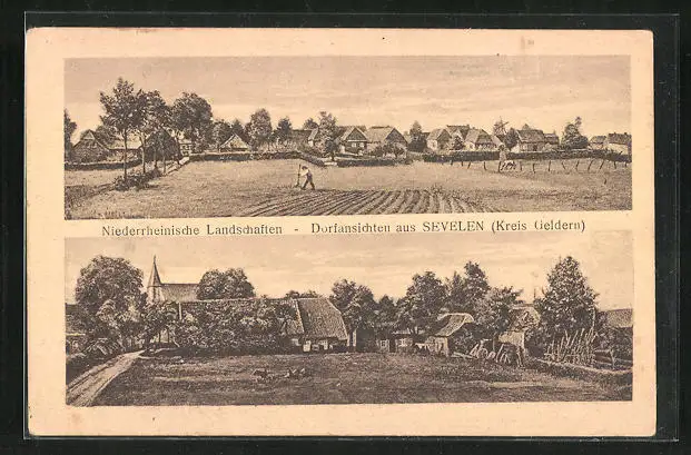 AK Sevelen, Panorama mit Windmühle, Ortspartie mit Kirche