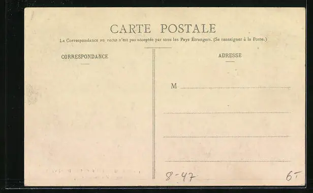 Personenbezogene Daten auf der Rückseite der Karte wurden durch blauen Textmarker unkenntlich gemacht. Die blauen Stellen sind auf die Vorderseite durchgeweicht und wirken sich negativ auf das Postkartenfoto aus