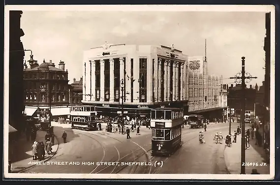 AK Sheffield, Angel Street and High Street, Strassenbahn
