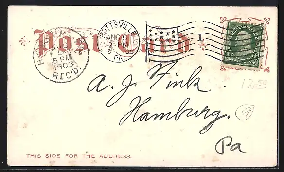 alte Ansichtskarte, gelaufen 1903, Stempelspur, kleiner Durchbruch oben re.