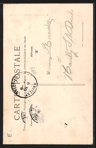 Personenbezogene Daten auf der Rückseite der Karte wurden durch blauen Textmarker unkenntlich gemacht. Die blauen Stellen sind auf die Vorderseite durchgeweicht und wirken sich negativ auf das Postkartenfoto aus