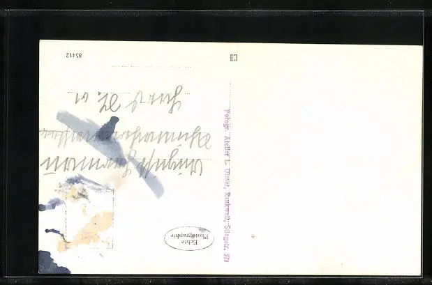 Personenbezogene Daten auf der Rückseite der Karte wurden durch blauen Textmarker unkenntlich gemacht. Die blauen Stellen sind auf die Vorderseite durchgeweicht und wirken sich negativ auf das Postkartenfoto aus