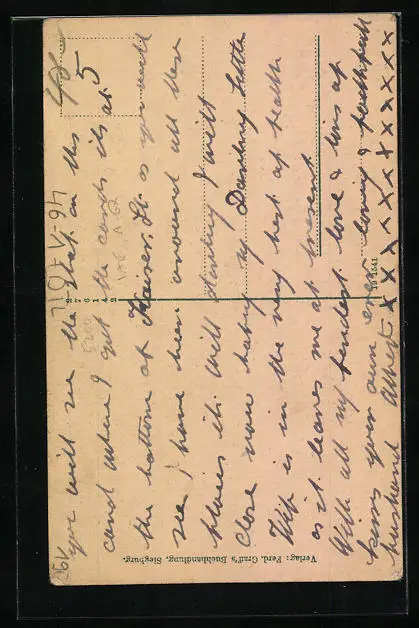 Personenbezogene Daten auf der Rückseite der Karte wurden durch blauen Textmarker unkenntlich gemacht. Die blauen Stellen sind auf die Vorderseite durchgeweicht und wirken sich negativ auf das Postkartenfoto aus