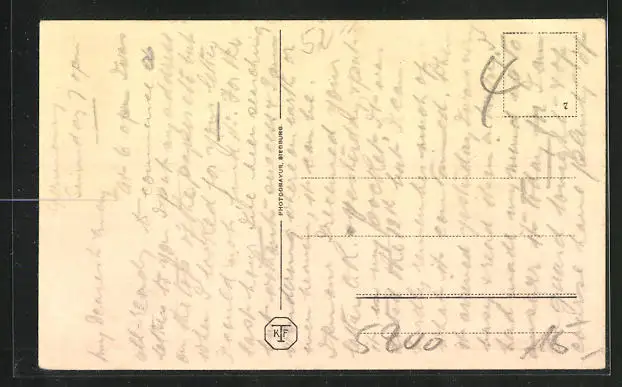 Personenbezogene Daten auf der Rückseite der Karte wurden durch blauen Textmarker unkenntlich gemacht. Die blauen Stellen sind auf die Vorderseite durchgeweicht und wirken sich negativ auf das Postkartenfoto aus