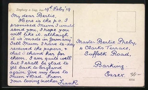 Personenbezogene Daten auf der Rückseite der Karte wurden durch blauen Textmarker unkenntlich gemacht. Die blauen Stellen sind auf die Vorderseite durchgeweicht und wirken sich negativ auf das Postkartenfoto aus