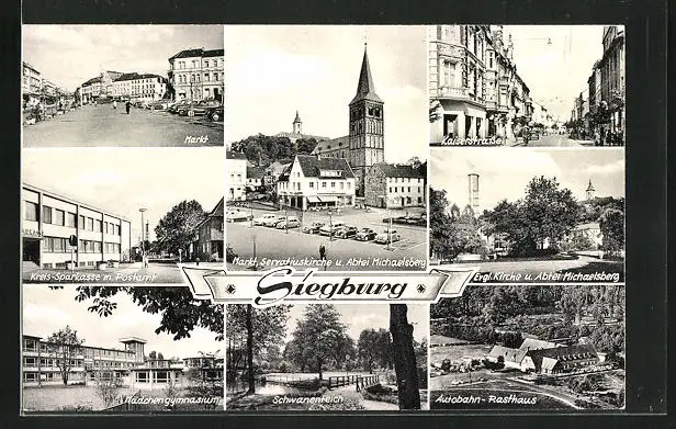 AK Siegburg, Marktplatz, Servatiuskirche und Abtei Michaelsberg, Kaiserstrasse, Evgl. Kirche, Mädchengymnasium