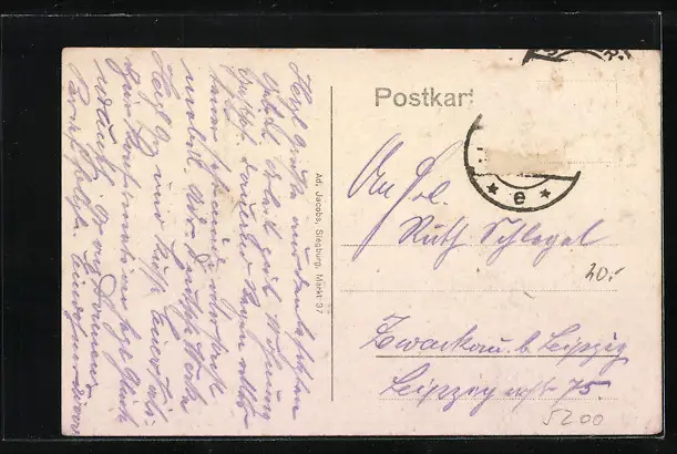 Personenbezogene Daten auf der Rückseite der Karte wurden durch blauen Textmarker unkenntlich gemacht. Die blauen Stellen sind auf die Vorderseite durchgeweicht und wirken sich negativ auf das Postkartenfoto aus