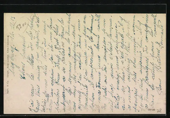 Personenbezogene Daten auf der Rückseite der Karte wurden durch blauen Textmarker unkenntlich gemacht. Die blauen Stellen sind auf die Vorderseite durchgeweicht und wirken sich negativ auf das Postkartenfoto aus