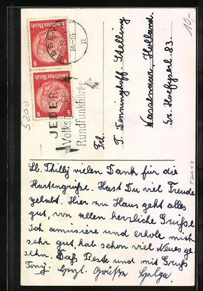 Personenbezogene Daten auf der Rückseite der Karte wurden durch blauen Textmarker unkenntlich gemacht. Die blauen Stellen sind auf die Vorderseite durchgeweicht und wirken sich negativ auf das Postkartenfoto aus