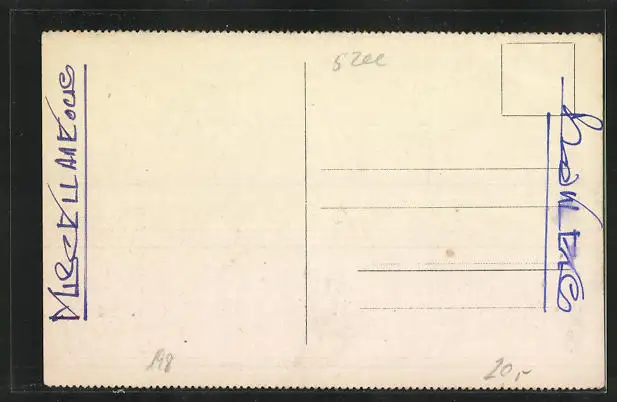 Personenbezogene Daten auf der Rückseite der Karte wurden durch blauen Textmarker unkenntlich gemacht. Die blauen Stellen sind auf die Vorderseite durchgeweicht und wirken sich negativ auf das Postkartenfoto aus