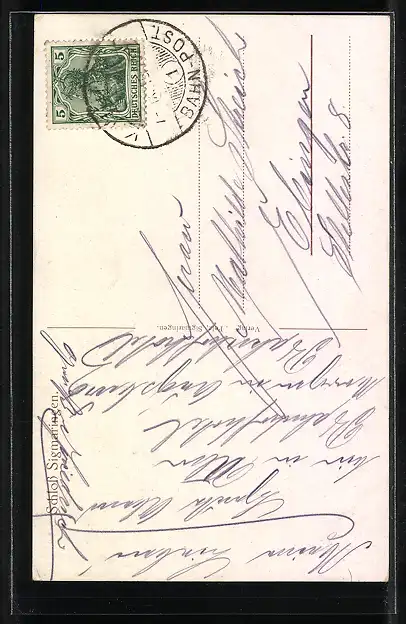 Personenbezogene Daten auf der Rückseite der Karte wurden durch blauen Textmarker unkenntlich gemacht. Die blauen Stellen sind auf die Vorderseite durchgeweicht und wirken sich negativ auf das Postkartenfoto aus