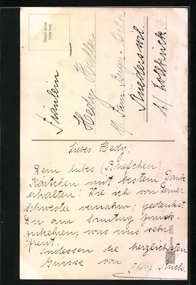 Personenbezogene Daten auf der Rückseite der Karte wurden durch blauen Textmarker unkenntlich gemacht. Die blauen Stellen sind auf die Vorderseite durchgeweicht und wirken sich negativ auf das Postkartenfoto aus