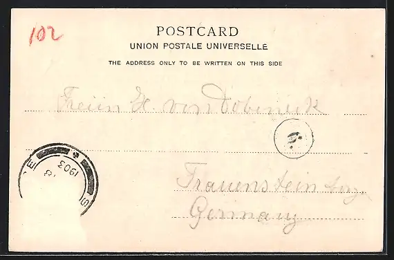 alte Ansichtskarte, gelaufen 1903, Briefmarke entfernt, rückseitig Oberflächenschaden, guter Zustand