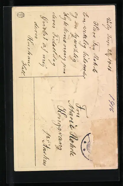 Personenbezogene Daten auf der Rückseite der Karte wurden durch blauen Textmarker unkenntlich gemacht. Die blauen Stellen sind auf die Vorderseite durchgeweicht und wirken sich negativ auf das Postkartenfoto aus
