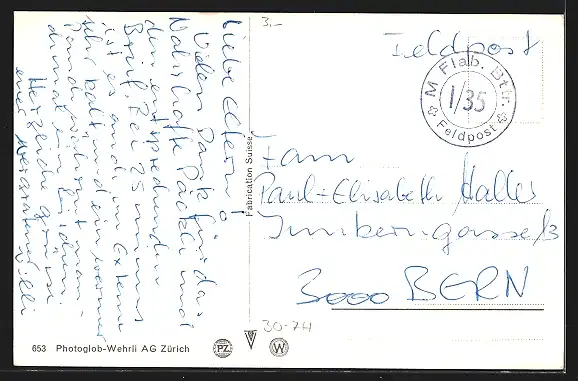 Personenbezogene Daten auf der Rückseite der Karte wurden durch blauen Textmarker unkenntlich gemacht. Die blauen Stellen sind auf die Vorderseite durchgeweicht und wirken sich negativ auf das Postkartenfoto aus