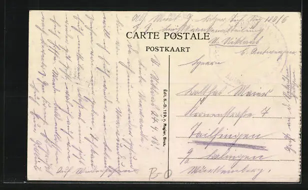 Personenbezogene Daten auf der Rückseite der Karte wurden durch blauen Textmarker unkenntlich gemacht. Die blauen Stellen sind auf die Vorderseite durchgeweicht und wirken sich negativ auf das Postkartenfoto aus