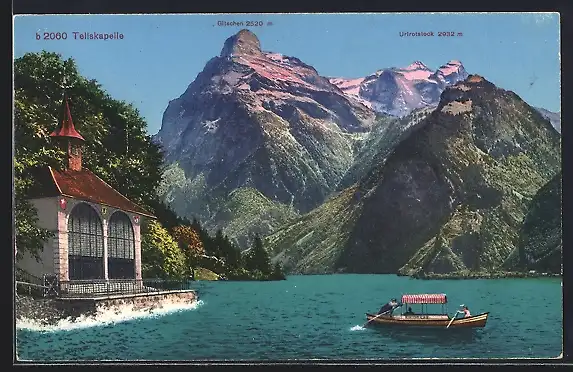 AK Sisikon, Tellskapelle mit Bergspitzen, Bootspartie