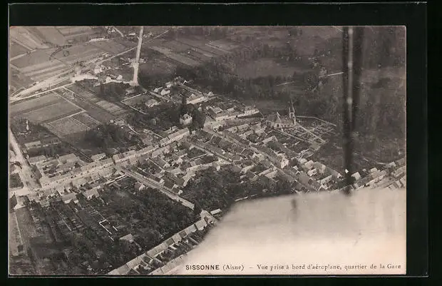 AK Sissonne, Vue prise à bord d'aéroplane, quartier de la gare