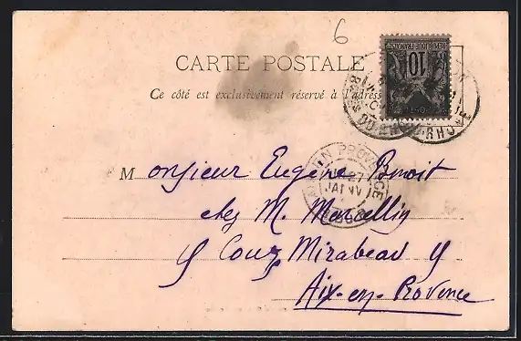 Personenbezogene Daten auf der Rückseite der Karte wurden durch blauen Textmarker unkenntlich gemacht. Die blauen Stellen sind auf die Vorderseite durchgeweicht und wirken sich negativ auf das Postkartenfoto aus