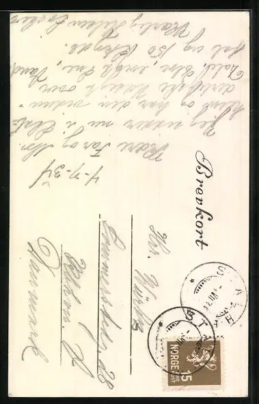 Personenbezogene Daten auf der Rückseite der Karte wurden durch blauen Textmarker unkenntlich gemacht. Die blauen Stellen sind auf die Vorderseite durchgeweicht und wirken sich negativ auf das Postkartenfoto aus